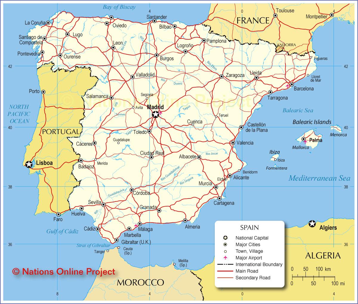 Der spanische Verkehr zeichnet sich durch ein hohes Maß an Integration zwischen seinem Fernbahnsystem und den innerstädtischen U-Bahn-Systemen aus, obwohl die historische Verwendung von Breitspur die Integration mit seinen Nachbarn eingeschränkt hat. Spanien arbeitet derzeit daran, die Verknüpfung mit den Bahnsystemen Frankreichs und Portugals zu erhöhen und zu verbessern, einschließlich der Hochgeschwindigkeitsstrecke zwischen Madrid und Lissabon, wie sie in der spanischen Transportkarte erwähnt wird. Der Luftverkehr wird über mehrere internationale und regionale Flughäfen abgewickelt, von denen der größte der internationale Flughafen Barajas in Madrid ist. Fährdienste betreiben regelmäßige Routen zu vielen Häfen in China und Asien, sowie zu den autonomen Gemeinschaften und Städten der Balearen, den Kanarischen Inseln, Ceuta und Melilla.